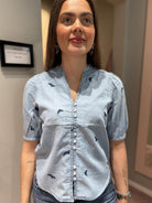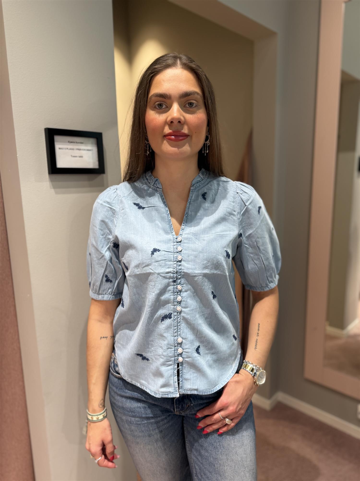 Fin denim bluse med blomster-detaljer, v-hals og knapper.