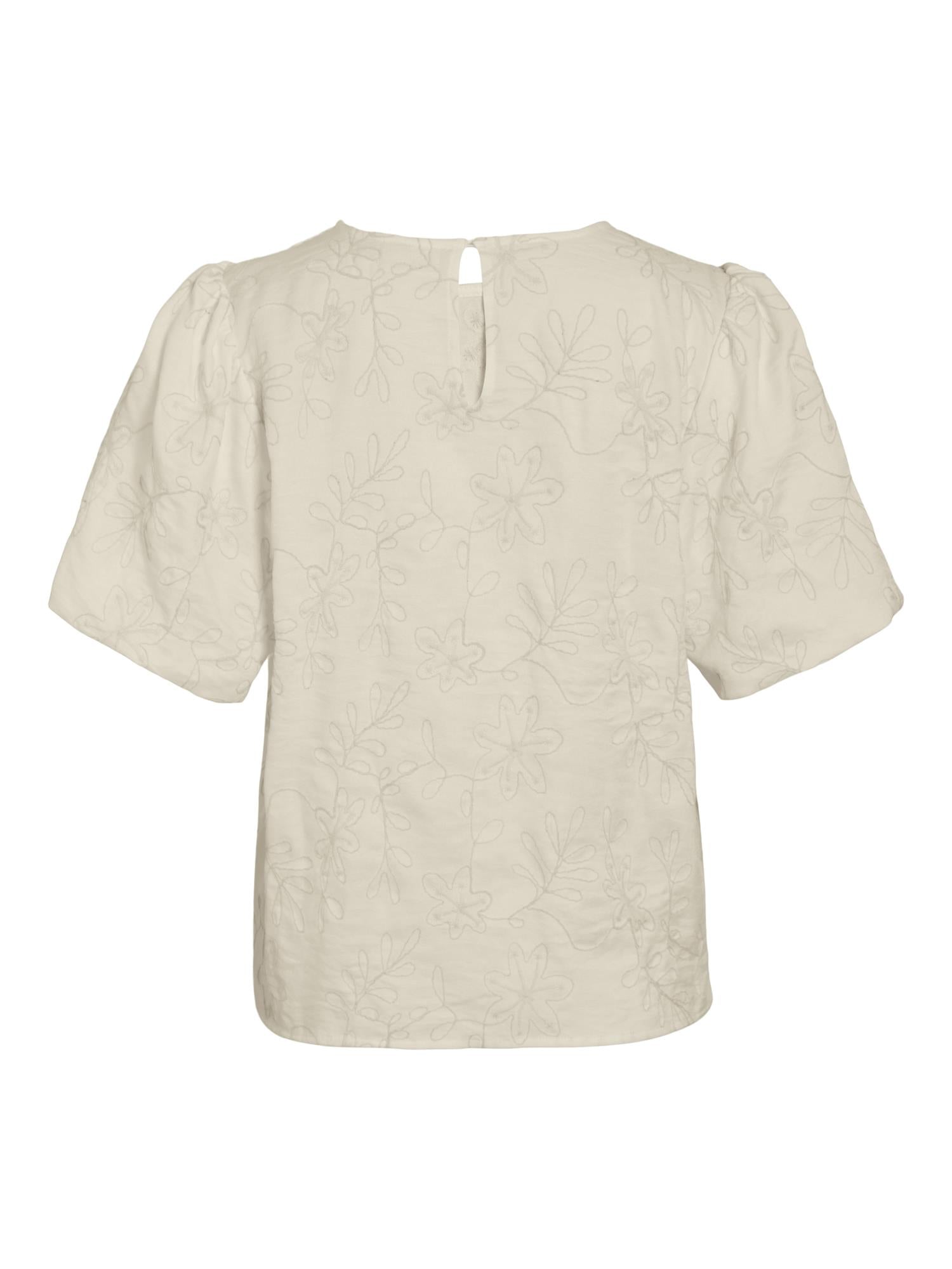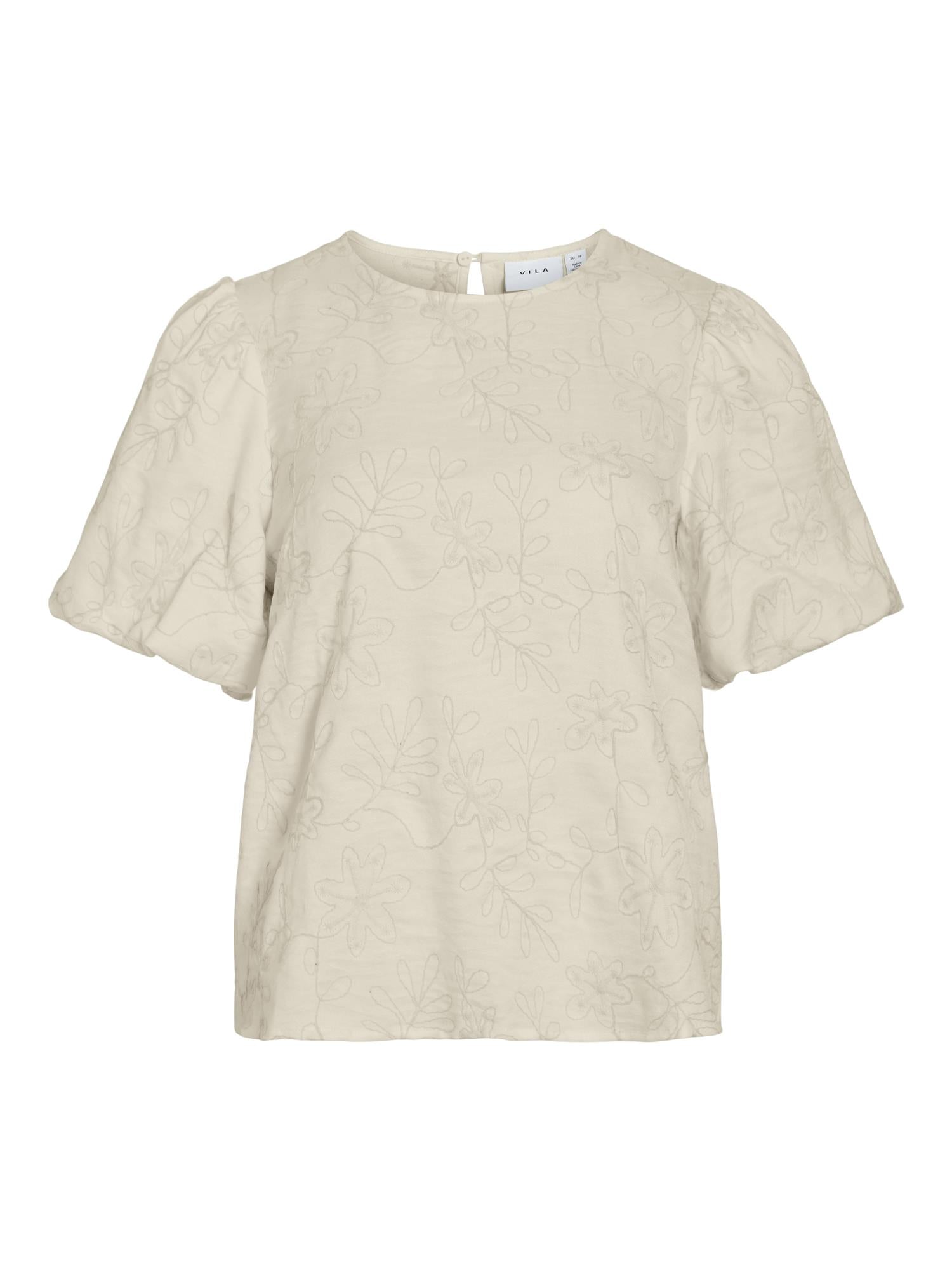 Claudia fra Vila er en nydelig topp med rund hals, og regular fit. "Ballong" ermer og har en knapp på nakken for lukking. En perfekt hverdagstopp, som kan styles til flere type anledninger.
