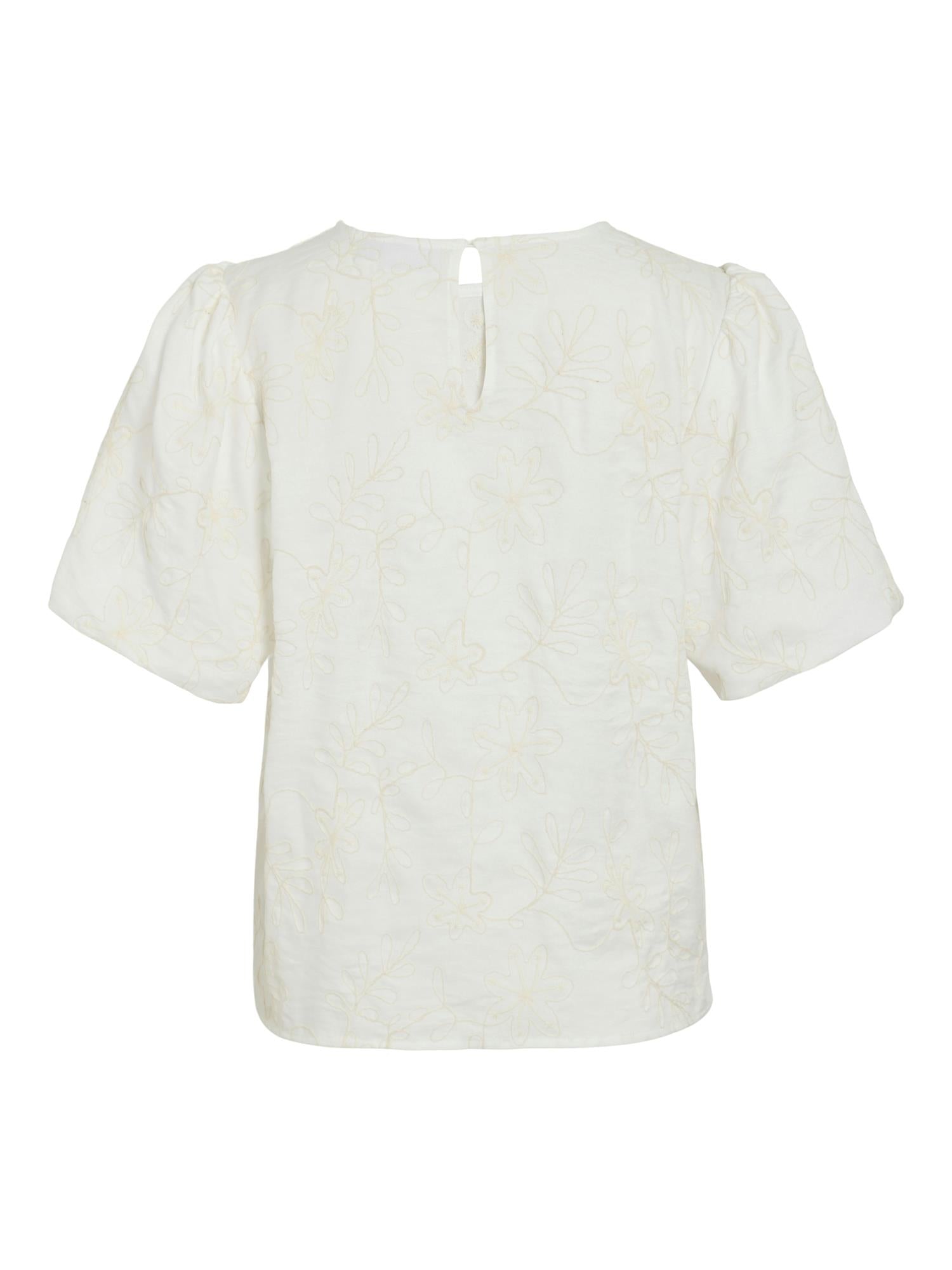 Claudia fra Vila er en nydelig topp med rund hals, og regular fit. "Ballong" ermer og har en knapp på nakken for lukking. En perfekt hverdagstopp, som kan styles til flere type anledninger.