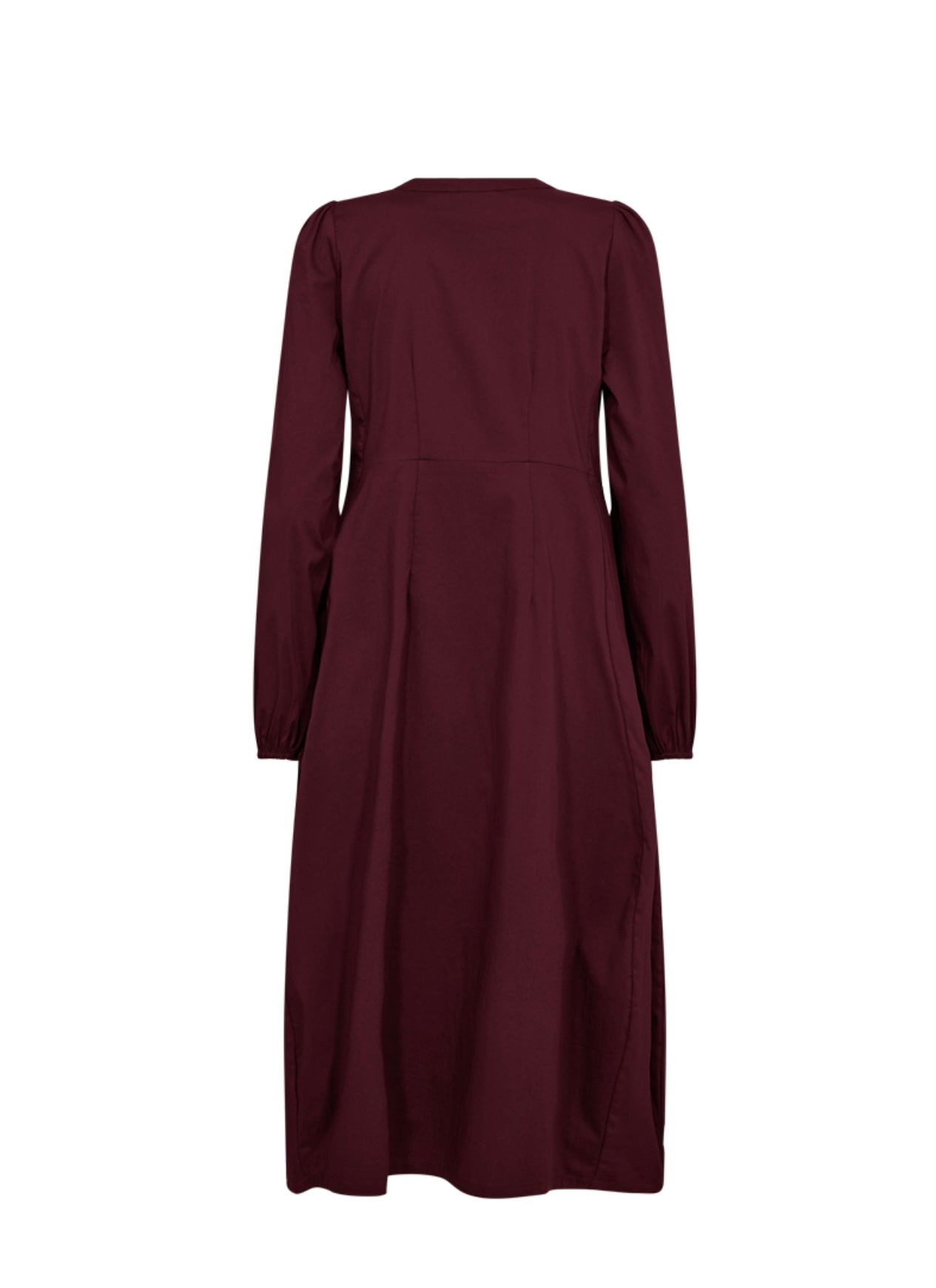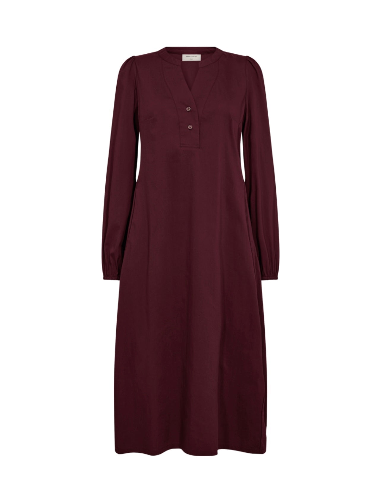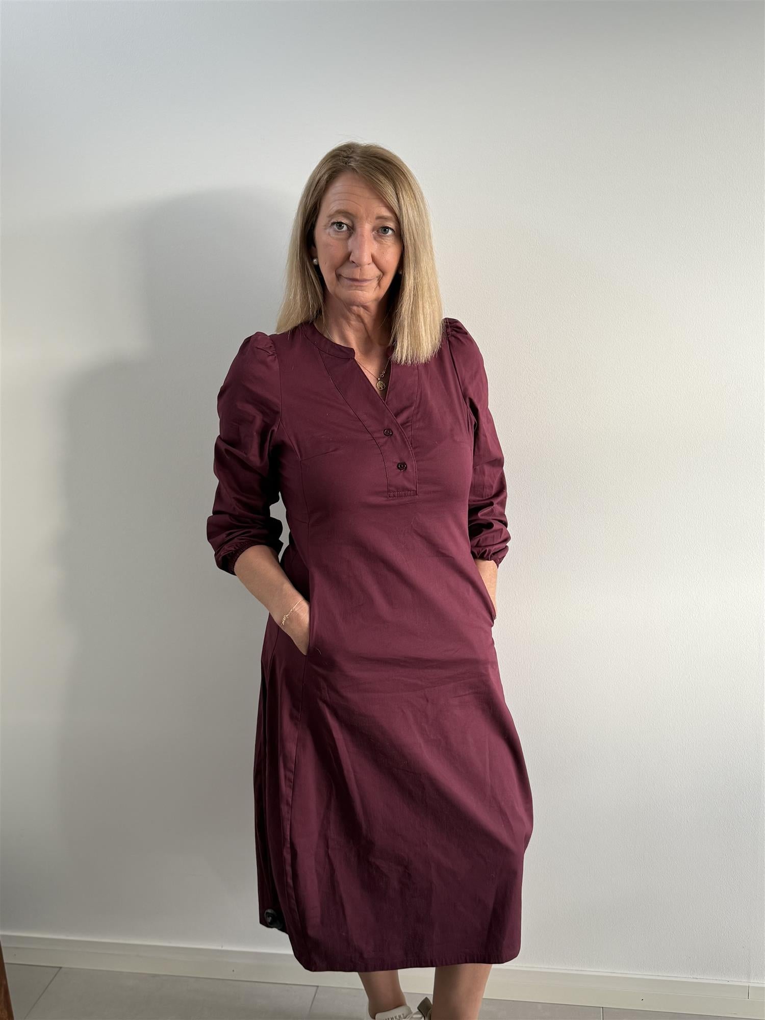 Røff og komfortabel midikjole med v-hals, strikk på håndledd og lommer i sidene. Kjolen er innsvingt nederst.