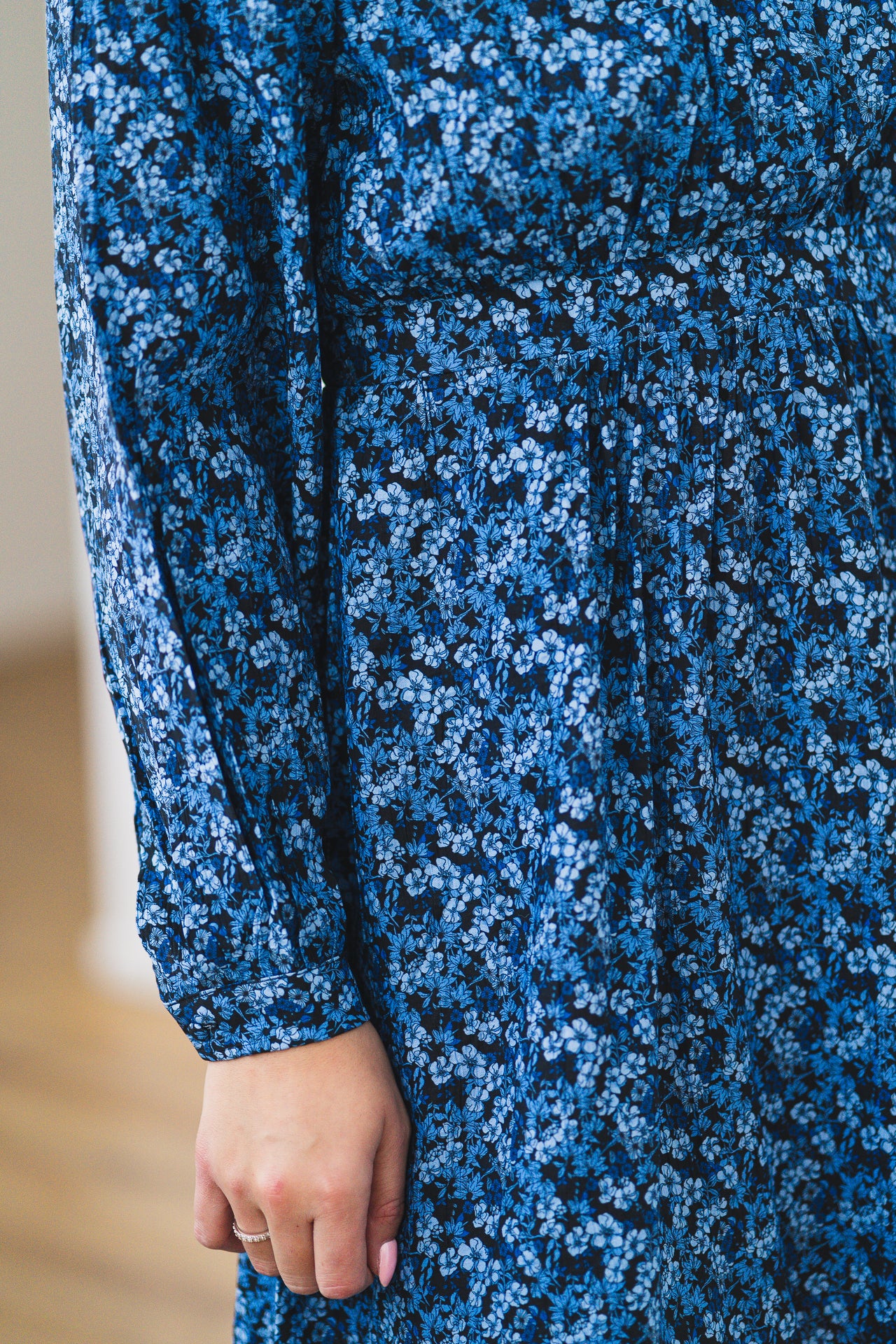 Kjole fra Raus utstråler en uimotståelig sjarm med sitt nydelige blomsterprint. Denne kjolen kombinerer en kort og flatterende lengde med lange ermer og en markert midje, som er justert med strikk på baksiden for å fremheve figuren. Den sjarmerende prestekragen med volanger og de delikate knappene på kragen tilfører et lekent og feminint preg, mens det friske blomstermønsteret i blått farge gir kjolen et elegant utseende. Laget i en blanding av viskose og polyamid, føles kjolen meget myk og behagelig mot huden.