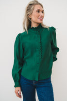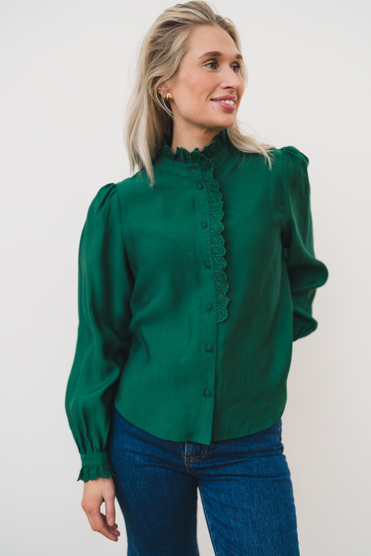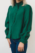 Olivia Shirt fra Raus er laget av et mykt materiale som føles behagelig på. Blusen har en flatterende passform med lange ermer og knappelukking i front. Den har volanger i kragen og nede ved ermene.