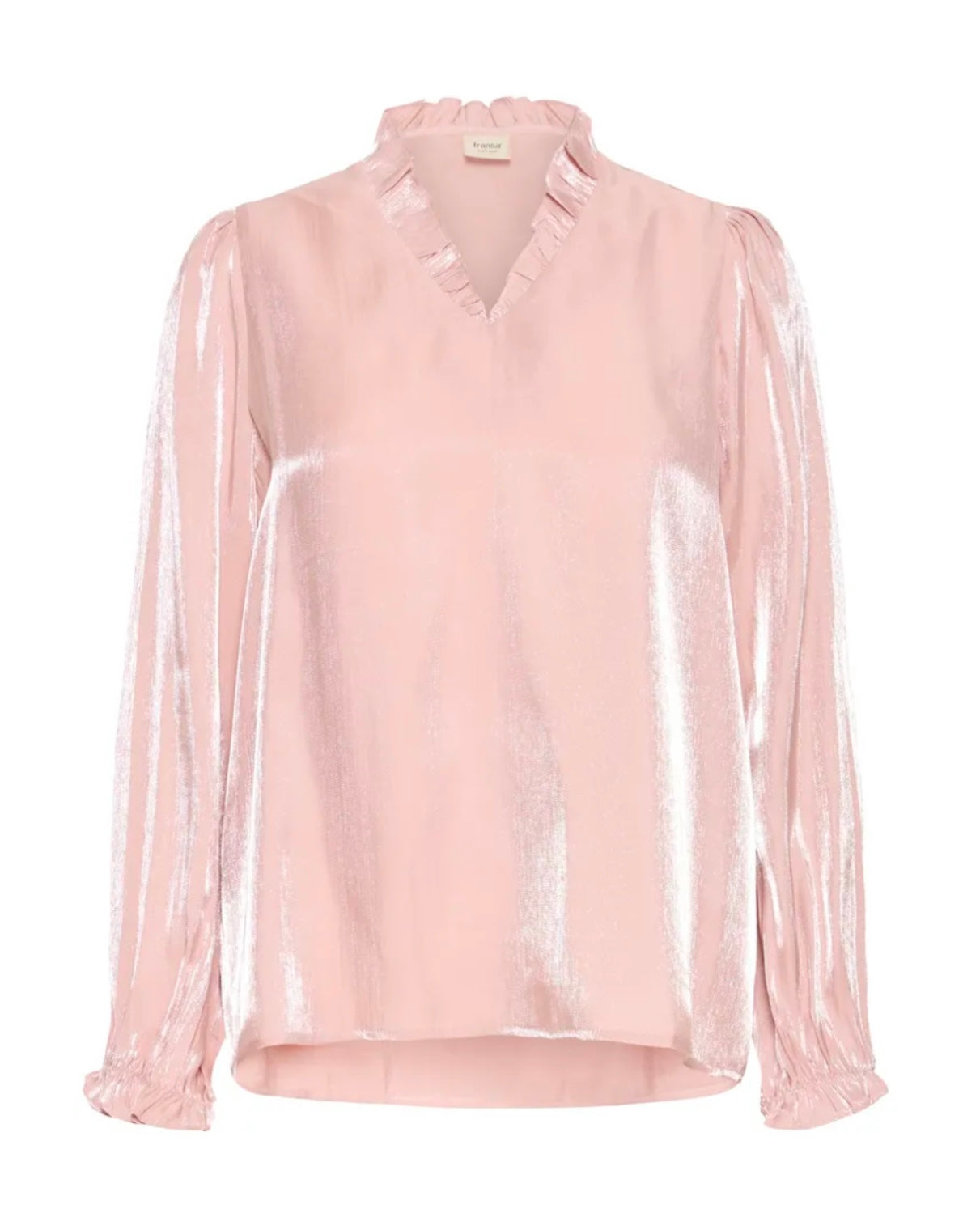 Yolanda Blouse fra Fransa er en elegant bluse med en eksklusiv glans og delikate detaljer. Den har klassisk skjortekrage, V-utringning og diskrete legg ved skuldrene som gir et feminint preg. Ermene avsluttes med strikk i mansjettene, noe som skaper en lett puffeffekt.