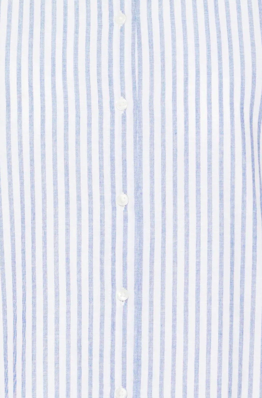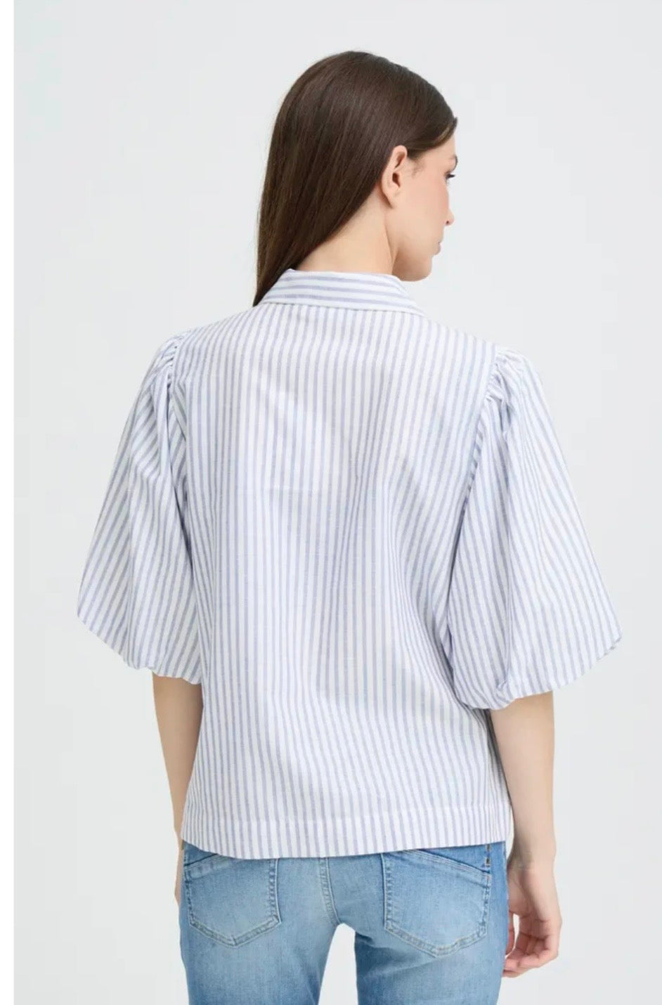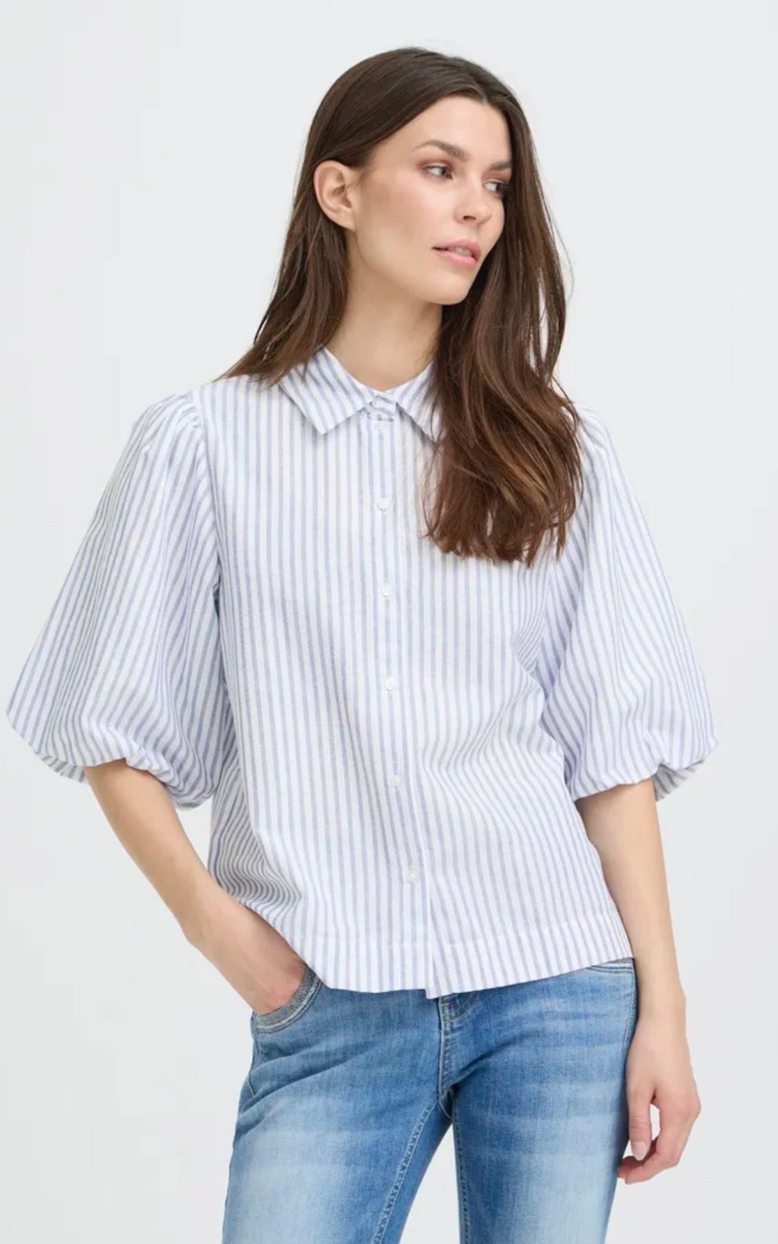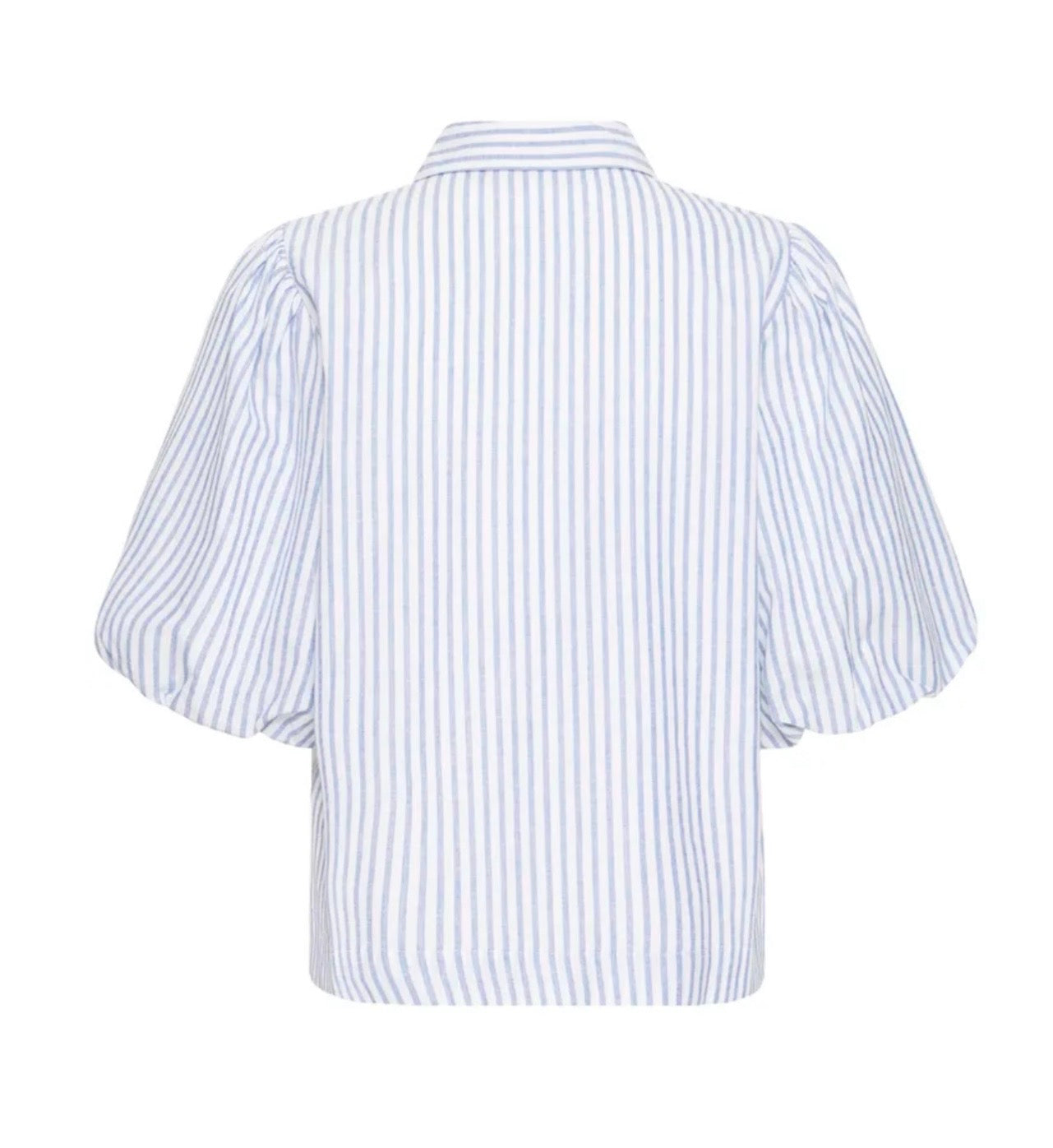 Audrey fra Pulz er en lekker stripete skjorte med krage, 2/4 lange ballongermer og knappelukking i front.