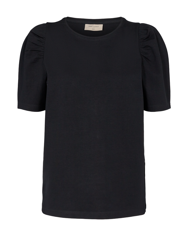 En T-skjorte fra Freequent, laget i et mykt materiale. Denne T-skjorten har en enkel silhuett med korte puff-ermer, en avrundet halslinning med ribbekant, samt en avslappet passform.