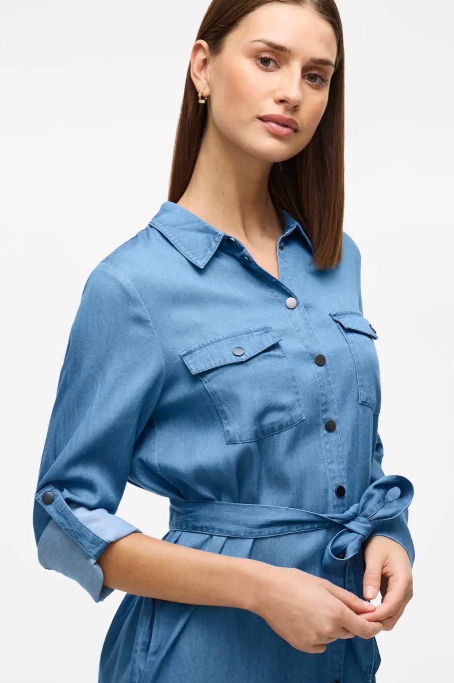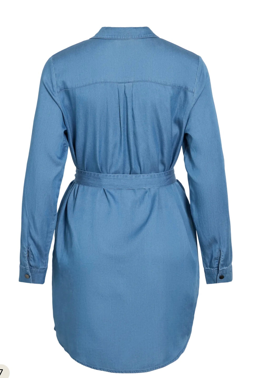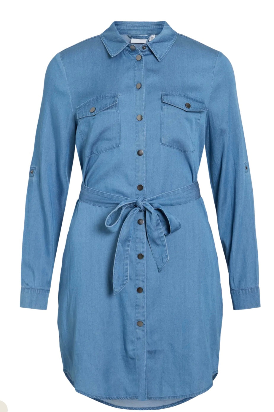Vibista Denim Dress fra Vila er en stilsikker skjortekjole i myk og lett denim, perfekt for både hverdag og mer oppkledde anledninger. Den har lange ermer, en klassisk skjortekrage og knappelukking i front, noe som gir den et tidløst uttrykk. Knytebeltet i midjen fremhever fasongen og kan enkelt tas av for en mer avslappet look.